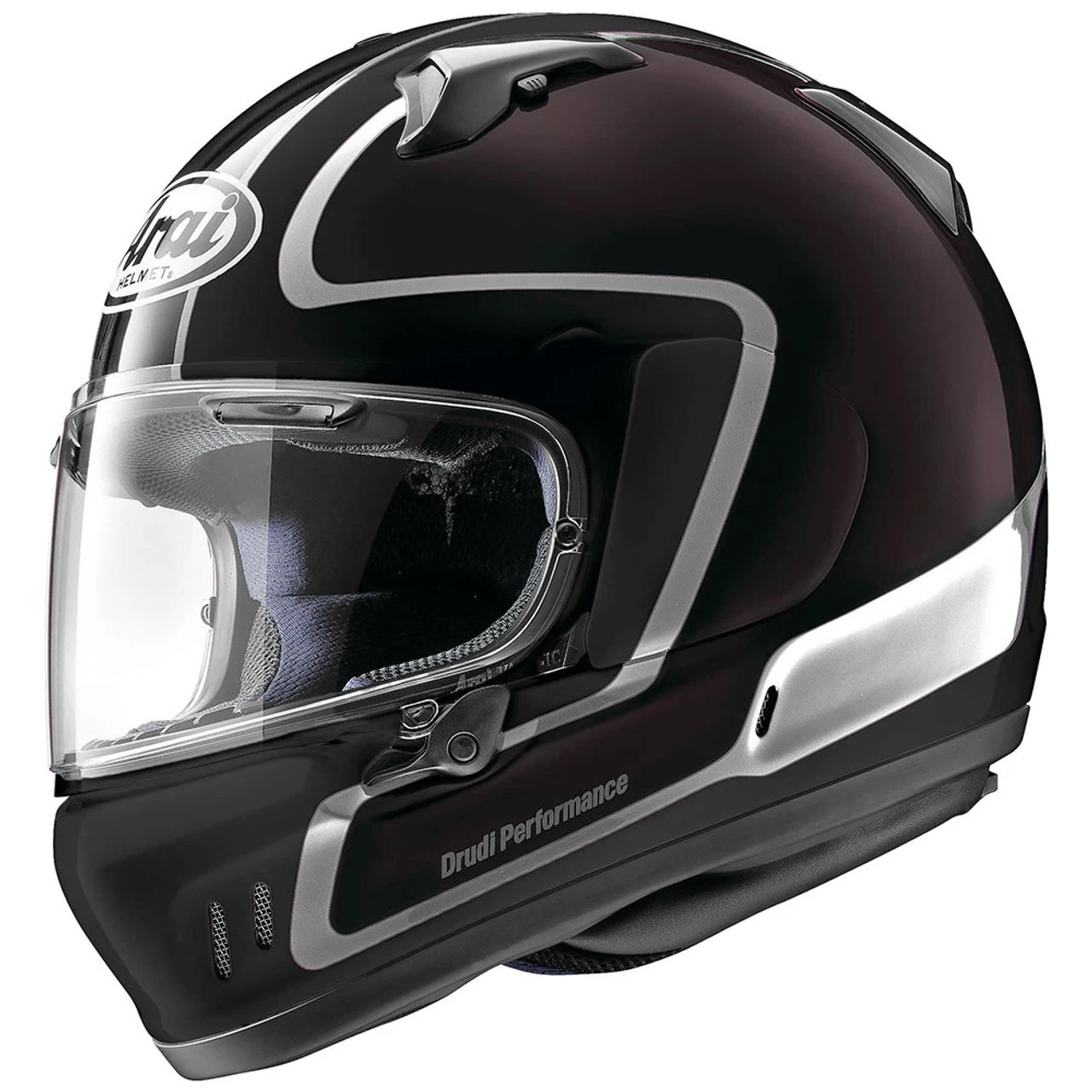 Arai’s combined their next level comfort, protection and feature set with a dash of retro styling to create the new Arai Defiant-X. Arai’s PB-cLc shell and one-piece, multi-density EPS liner deliver unparalleled protection. Mouth vent with internal shutter enhances the strong shell design. The Defiant-X comes standard with a VAS Max Vision faceshield to provide better visibility in all seasons and for all types of riding. The VAS shield is smaller and lower than the previous design with adjustable air intake vents that provide improved sealing, which decreases road noise and water intrusion. Get the feature-packed Arai Defiant-X with a slick glossy finish that’s accented with silver striping.
