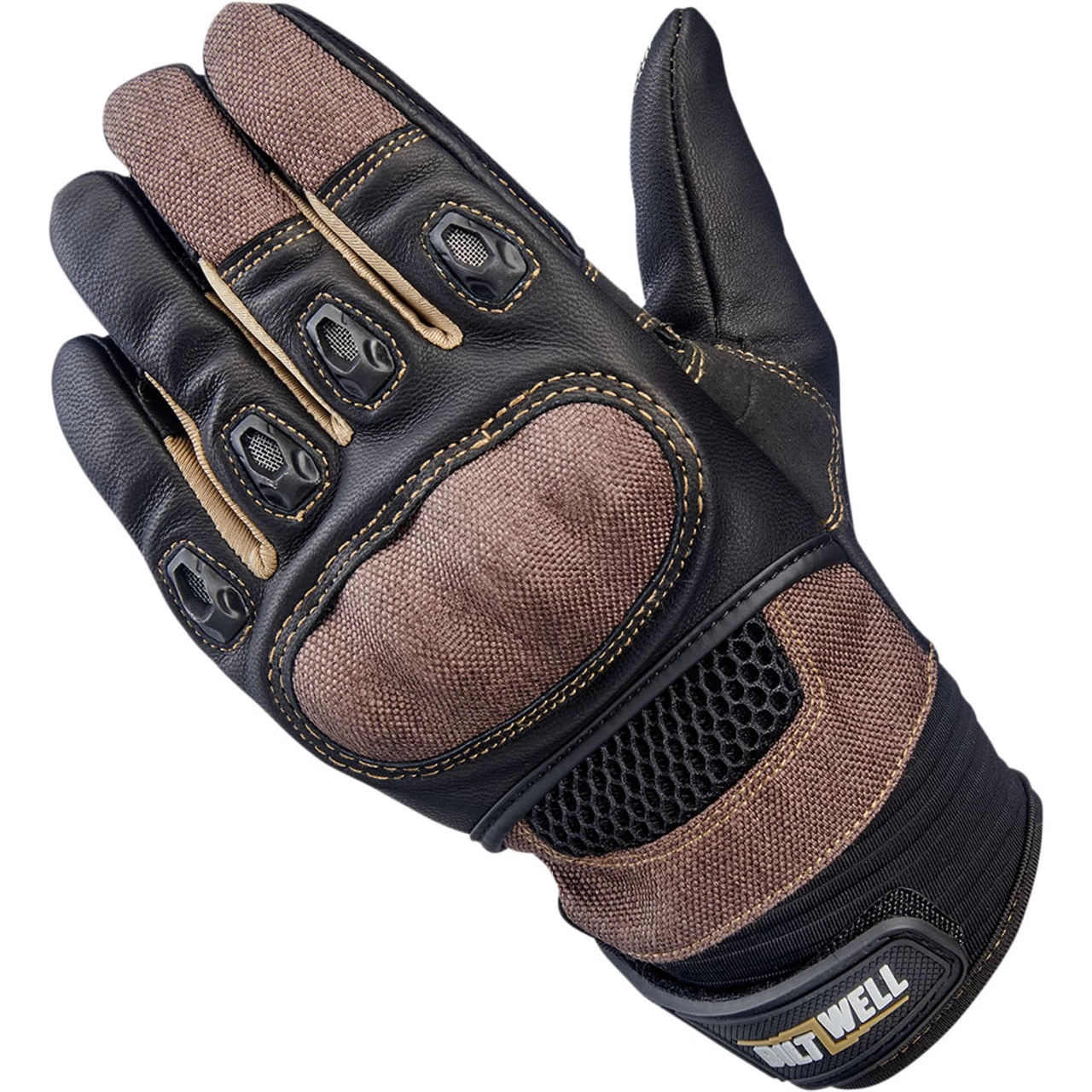 New for 2021 Biltwell brings you their Bridgeport gloves. These gloves combine quality leather, ballistic nylon panels and padded plastic knuckle guard. Plus keep your grip with the silicone traction logo on the palm. Grab their Chocolate/Black graphic.