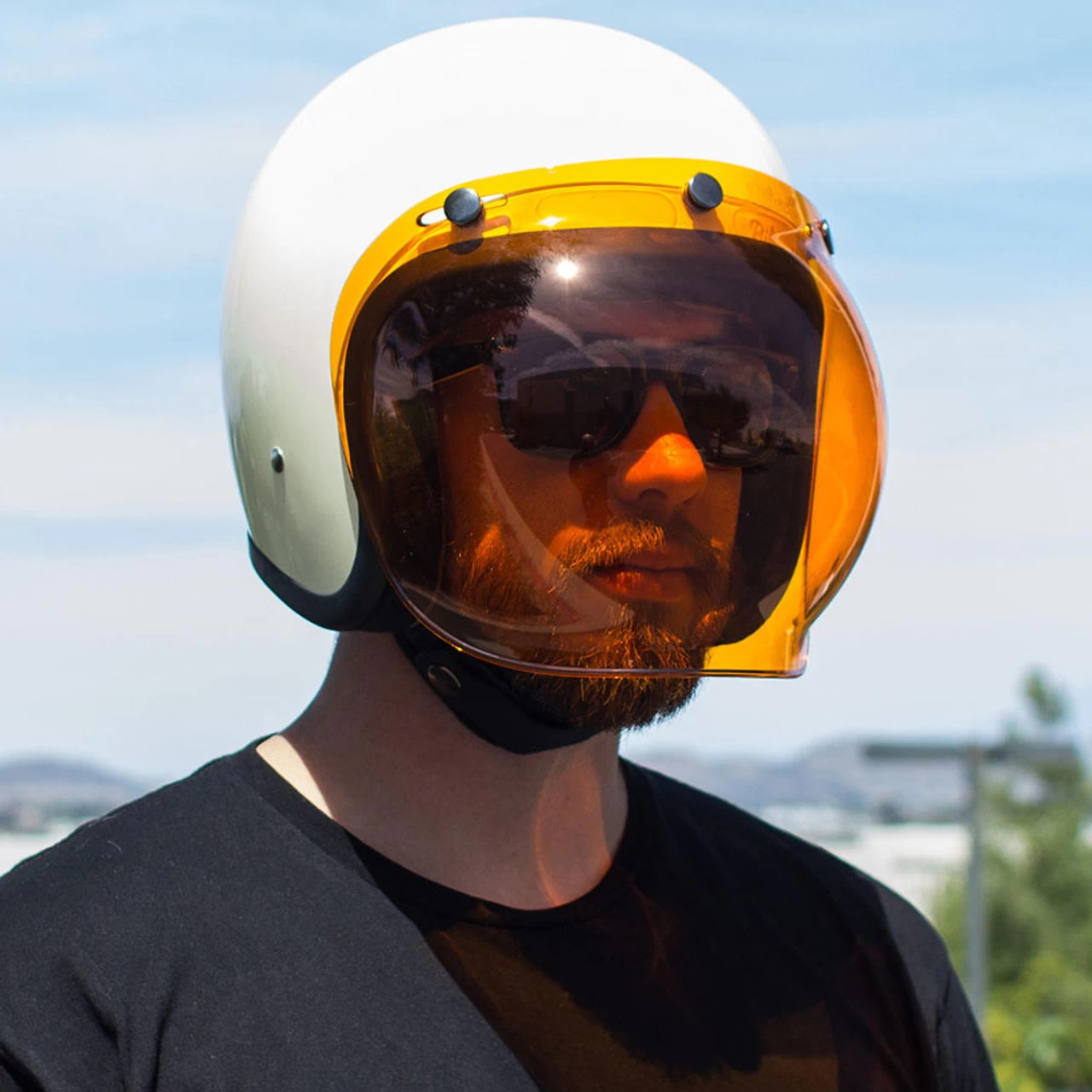 The 3-Snap Biltwell Bubble Shield comes in an amber orange finish with Biltwell’s new antifog coating. Enjoy it on your Biltwell Gringo, Biltwell Bonanza and most helmets with a 3-snap visor configuration.