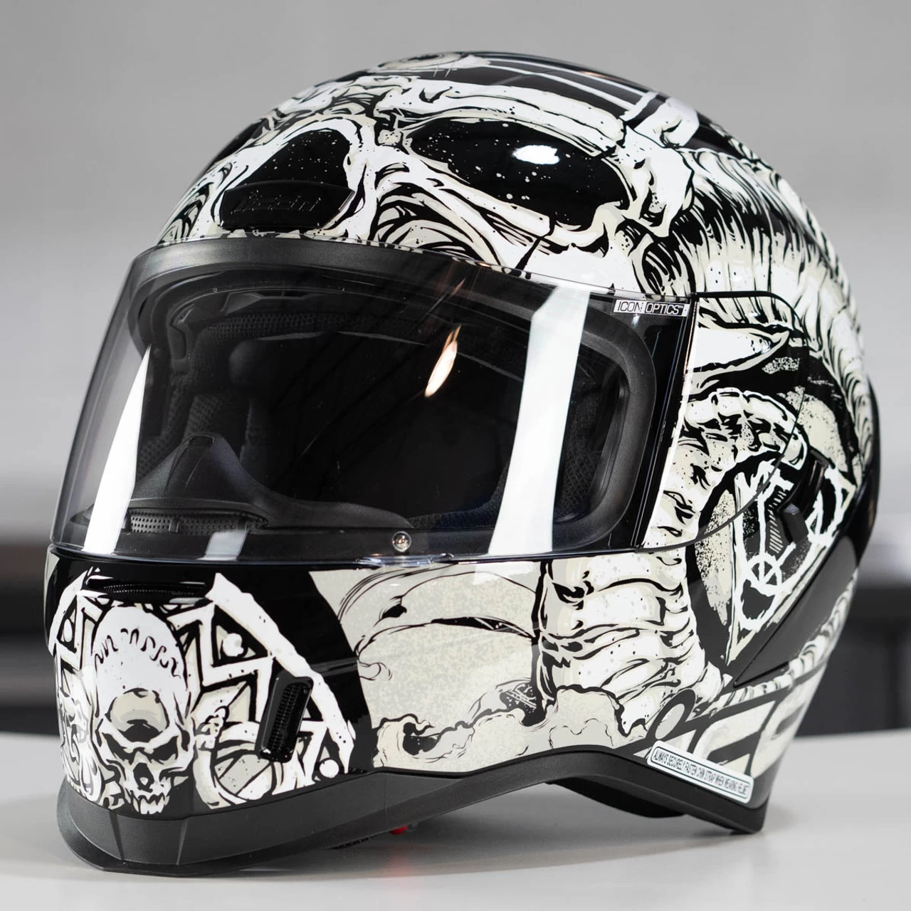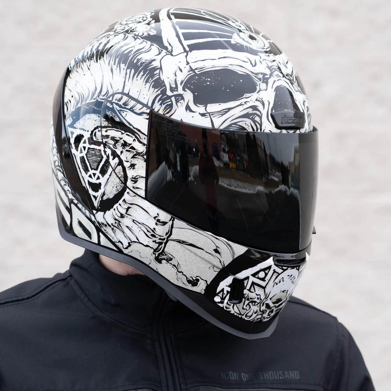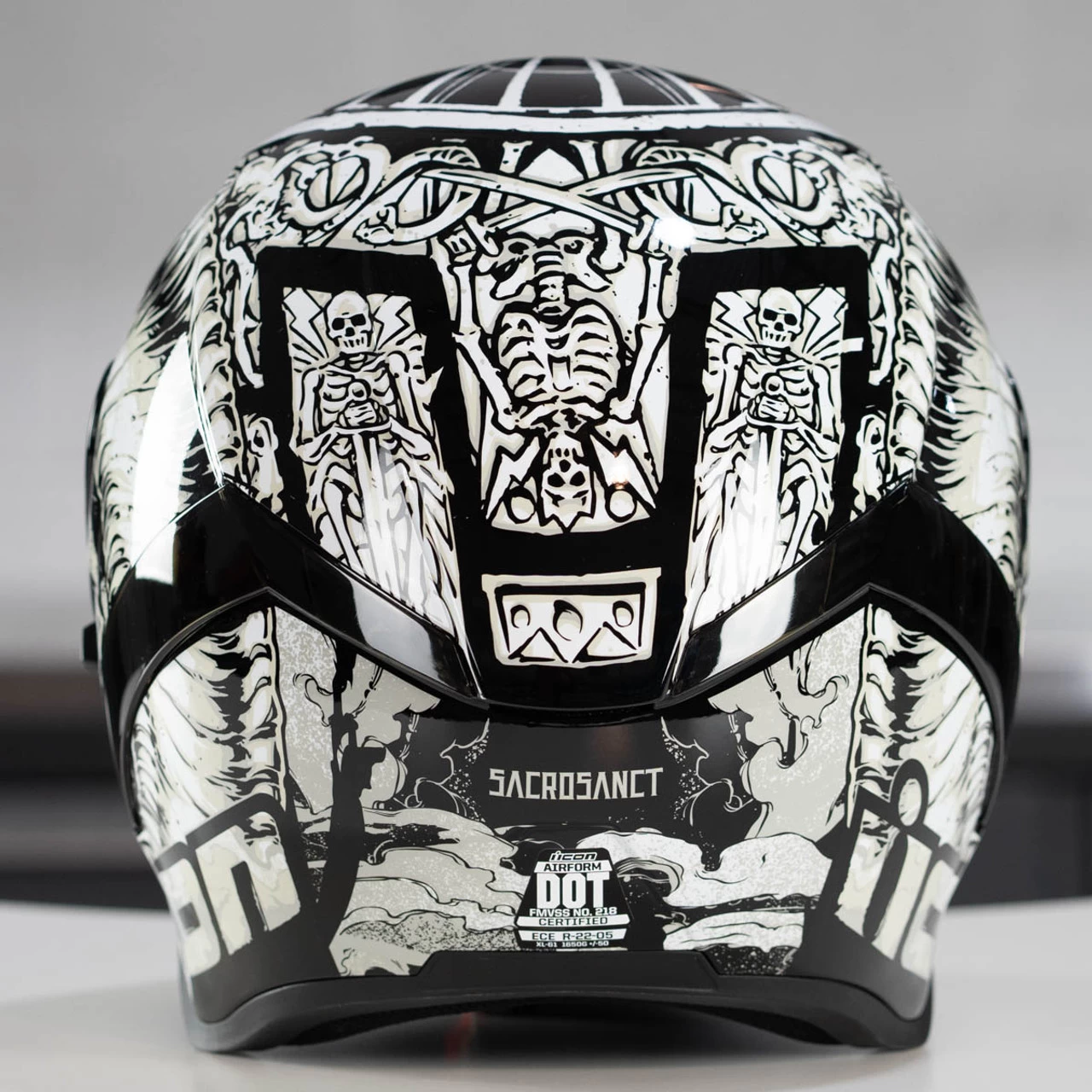 New helmet, new graphics. The Icon Airform boasts an impressive price point with a malevolent spell bound Sacrosanct graphic to defy what you think a helmet should conform to. Crop circles, wizardy and aliens complete the look for this lid. Select your color and ride into the world showing your defiance for the norm.