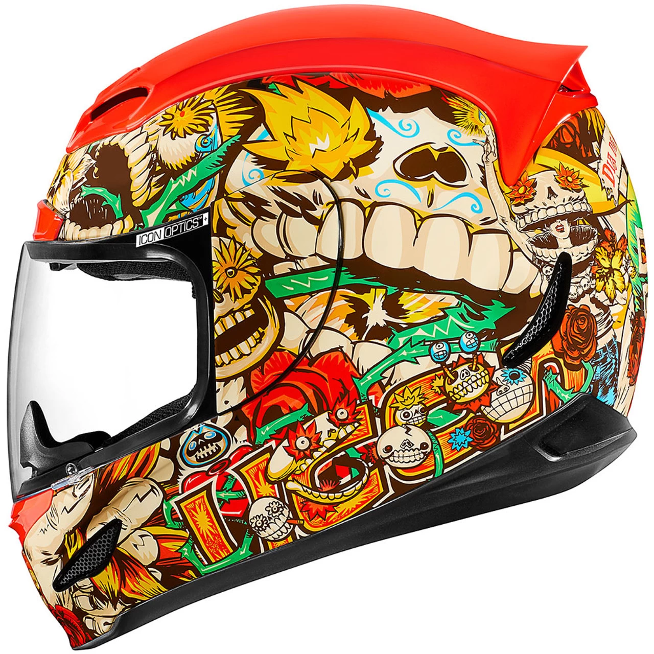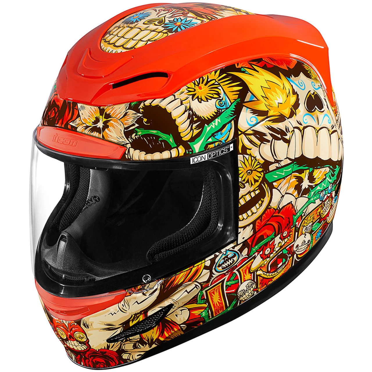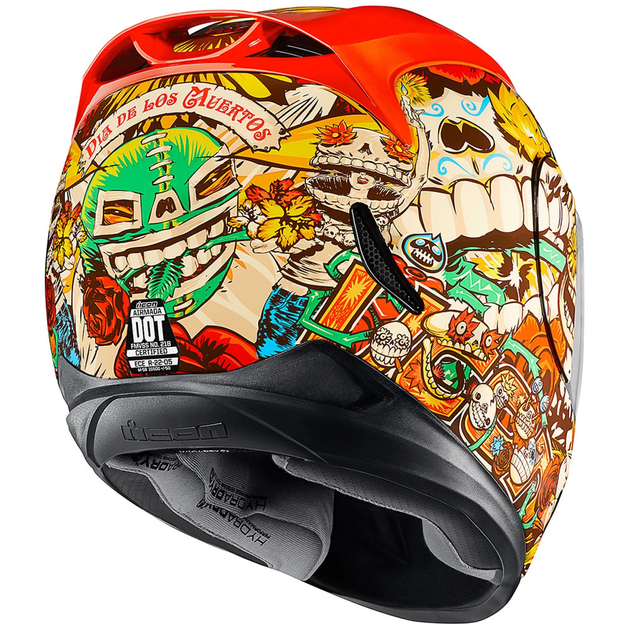 Brought back from the past after years of hiding in Icon’s closet, the Day of the Dead helmet is a tribute to those who have come and since passed on before us. May we ride and remember families and loved ones through the symbolic Dia de le Muertos Airmada helmet graphic.