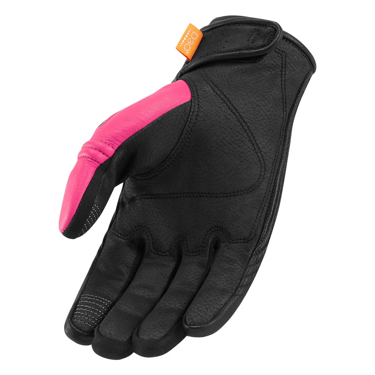 The Icon Automag Gloves are a nice combination of comfort and durability and give women riders a set of leather gloves that go heavy on style, functionality and features. The Automag glove is constructed from a supple goatskin chassis with abrasion-resistant Ax Suede palm overlays. D3O inserts add reinforcement, and the accordion flex zones ensure optimum performance while maintaining fit and flexibility. The touchscreen-enabled index finger and thumb allow you to use your devices without removal of the glove. Pickup a set of Icon Automag Gloves in a black and pink combination.
