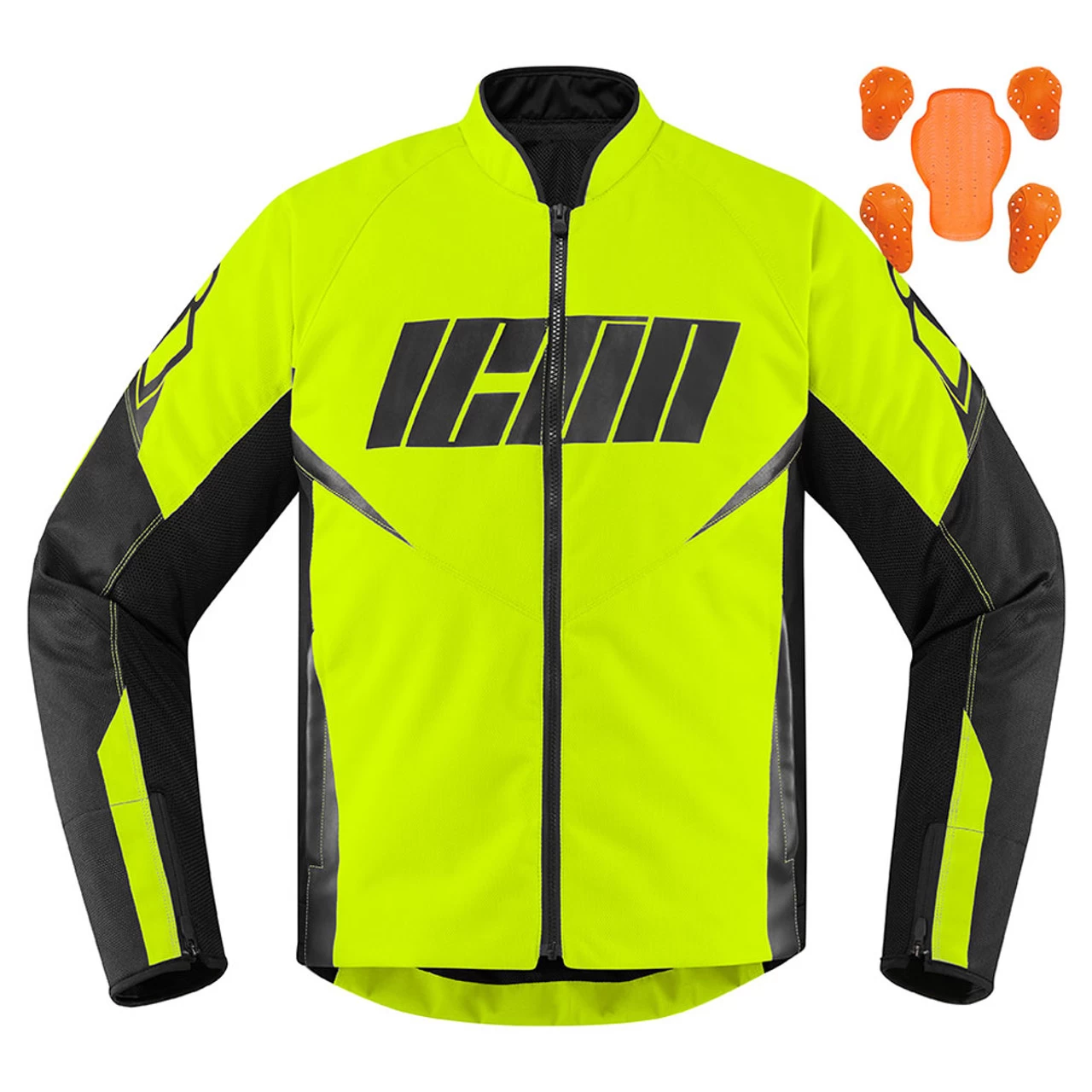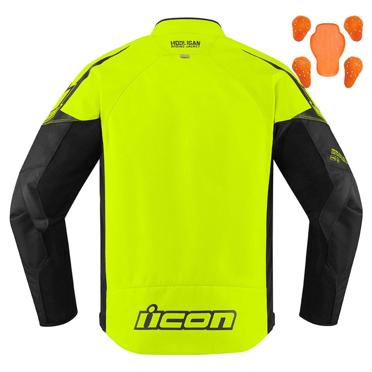 Comprised of a durable textile chassis and integrated with Iron Weave Mesh™ ventilation panels for excellent airflow, the ICON Hooligan™ jacket is perfect for hot days and fast rides. Internally, the Hooligan™ features a full suite of D3O® armor (back, elbow, and shoulder) just in case you have a solo dance with the gravel-strewn asphalt. Playing rough in the streets is the name of the game, and the Hooligan™ leads the pack. Pickup the Icon Hooligan Jacket in a hi-viz yellow with black accenting.