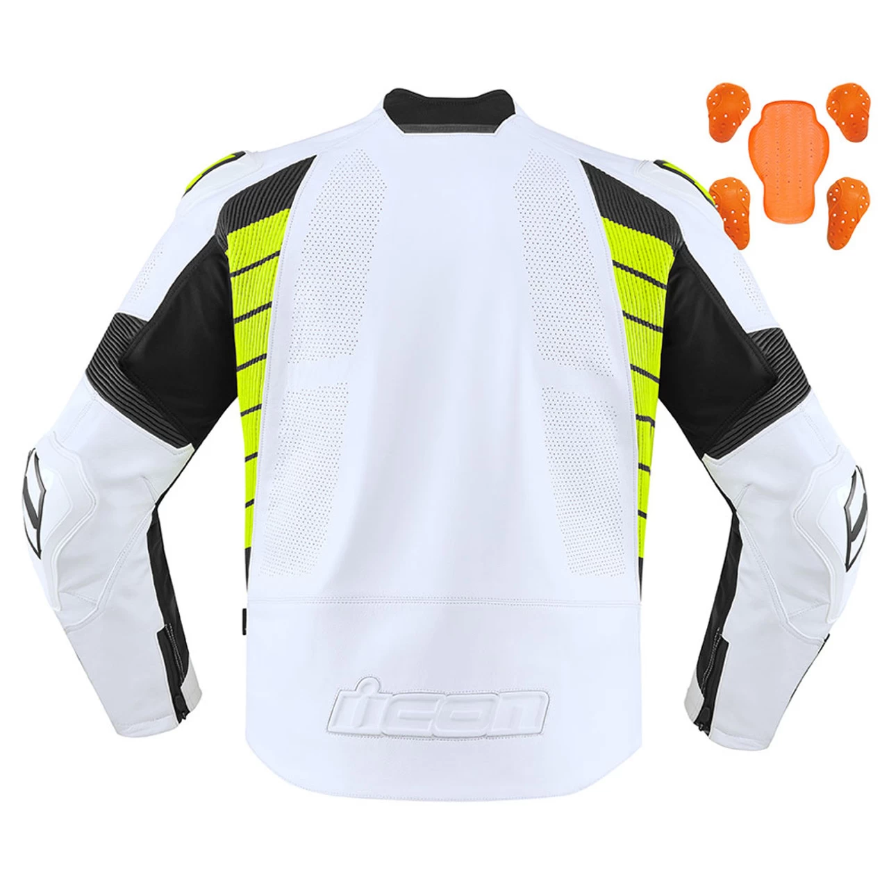 High speed performance: the Hypersport2 Primeâ„¢ jacket is the upper echelon of the ICON line. A stylish blend of 1.1-1.3mm TracSpecâ„¢ leather and textile, coupled with ICON’s Attack Fit, creates a jacket built for velocity. A full D3O® impact protector package (elbow, shoulder, back) and the accordion leather flex zones allow for a jacket that contours to your body straight off the rack. Deep chest pockets that double as chest vents, reinforced perforation zones, retro-reflective hits, and a padded microfleece comfort liner collar are just a few of the rider-centric details you’ll find. For the throttle jockey, we’ve added an internal waist zipper that connects to the Hypersport Primeâ„¢ pant, perfect for track use. Enjoy the Hypersport2 Prime Jacket in White/Gray/Hi-Viz.