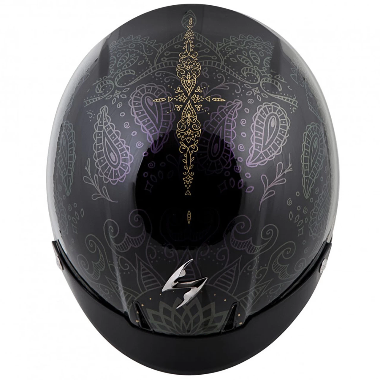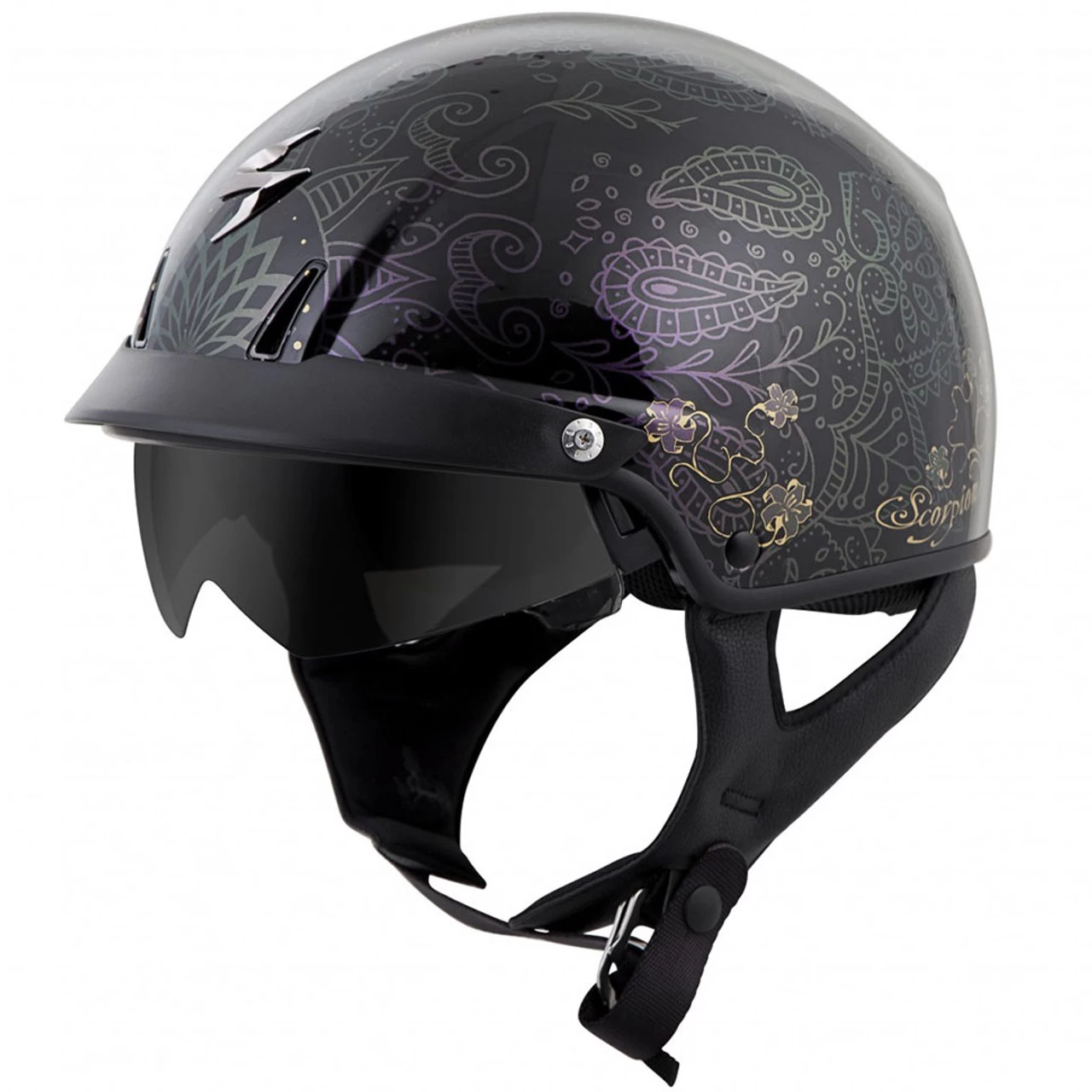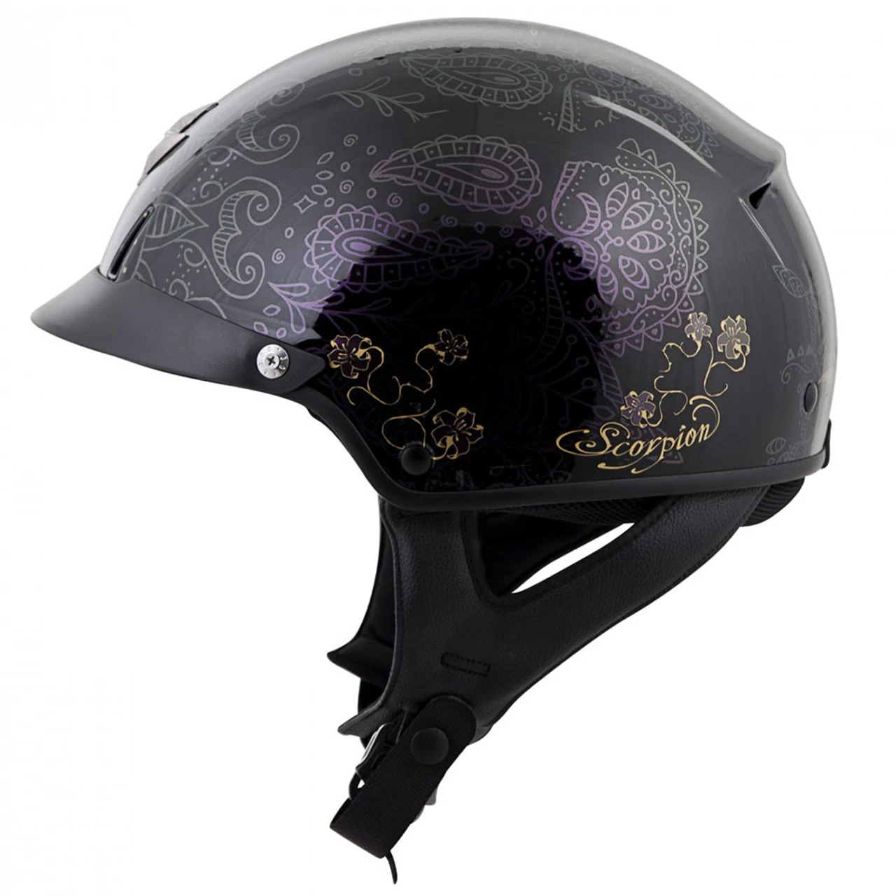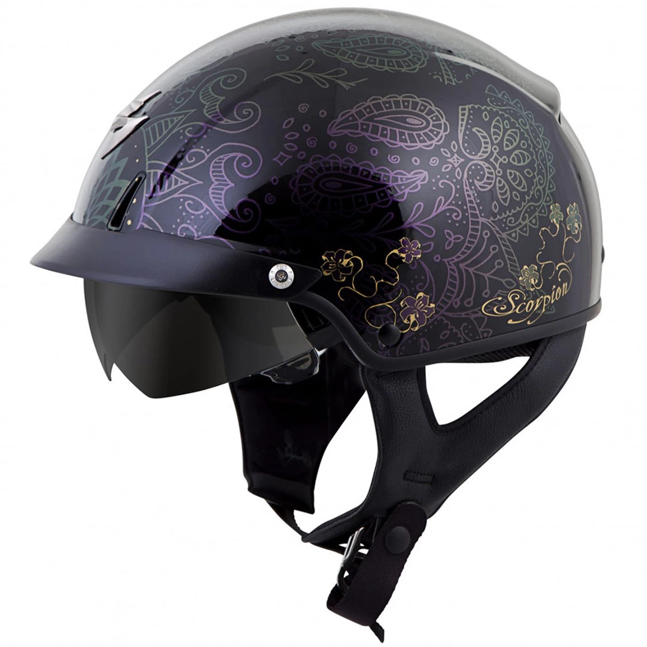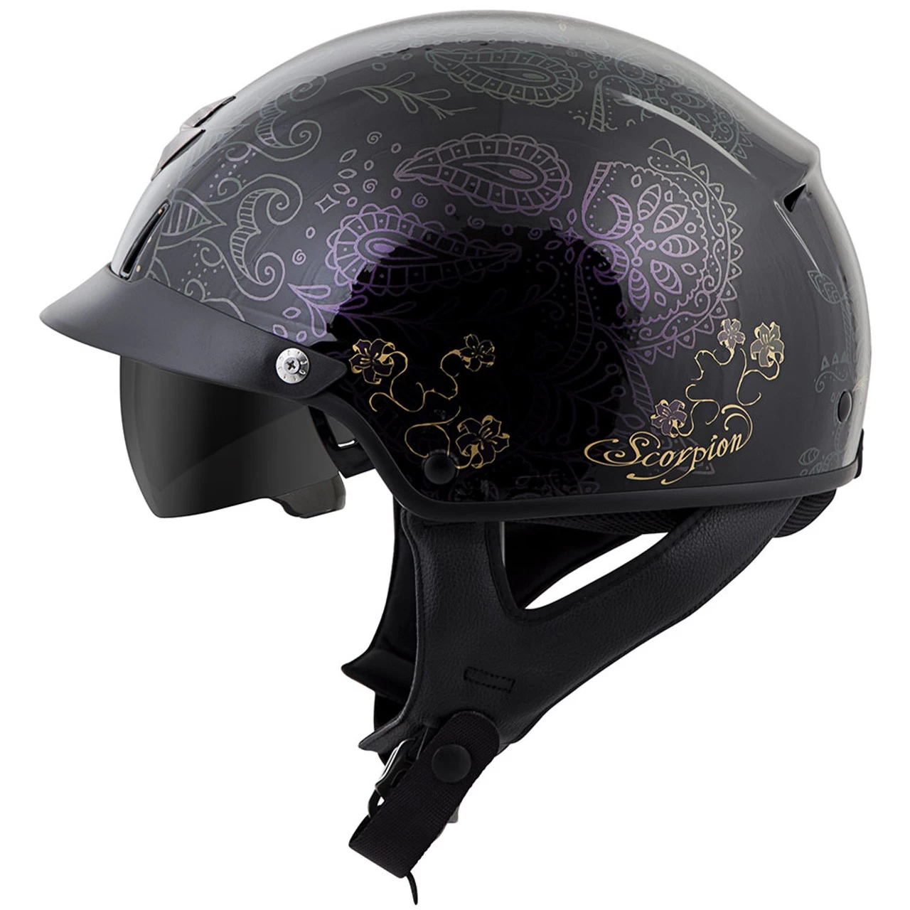 The Scorpion new EXO-C110 Azalea Helmet adds a nice gold and purple design overtop of a black based half helmet. The drop down shield is a practical, useful addition to the helmet, which also features a removable peak.