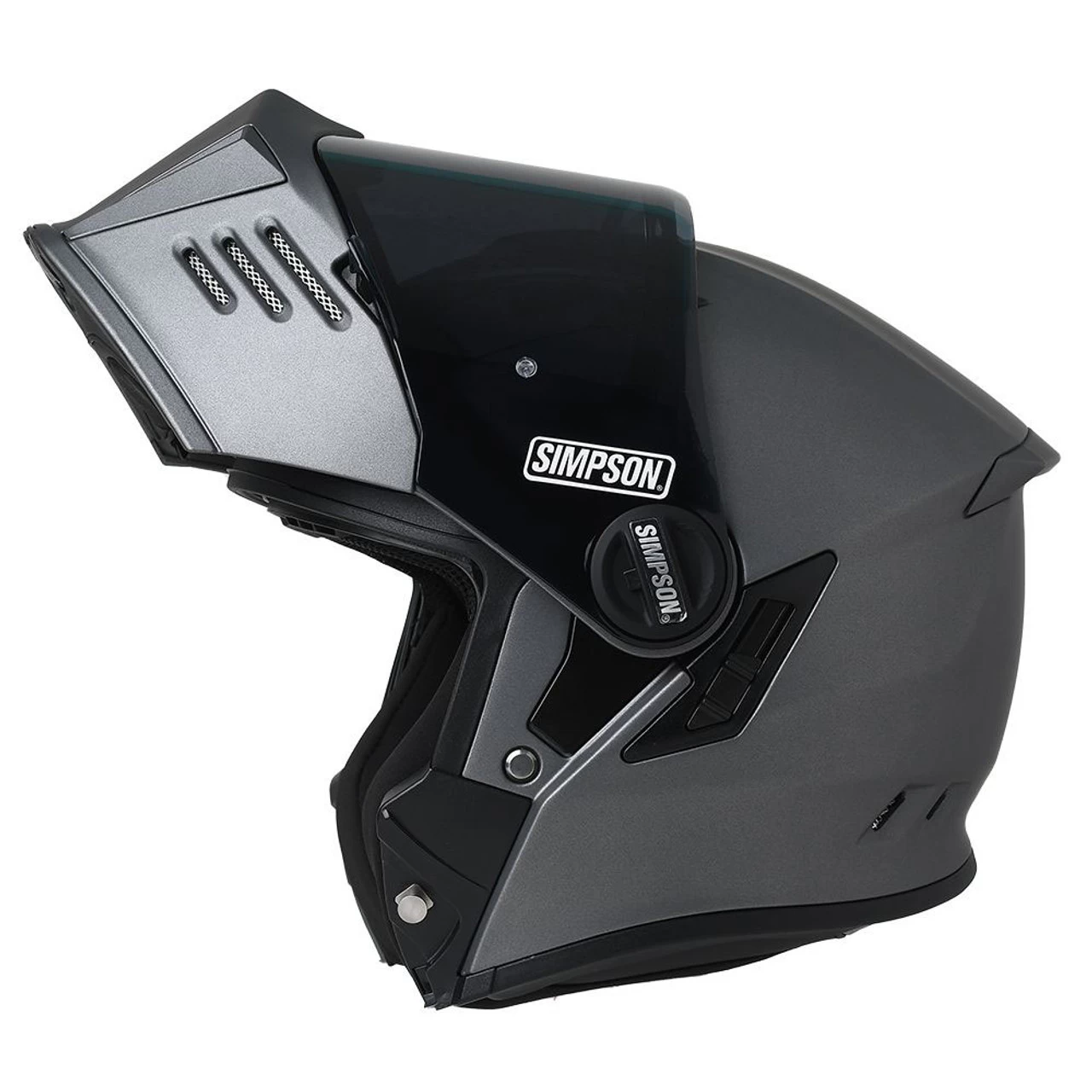 The new Simpson Mod Bandit breaks the mold… it’s an aggressive, street inspired helmet that goes next level with a modular design. It features a flip up front chin bar as well as an internal drop down visor. Plus it’s got the venting and aggressive lines built in for the tough look that Simpson is famous for. Riders will enjoy plenty of new perks from the Simpson Mod Bandit – one hand modular function, communication system ready, Pinlock system compatible, and an internal sun shield. Ready to ride across town or around the world, the Mod Bandit offers the function and style you are looking for with plenty of flexibility. Grab your new aggressively styled Modular Bandit from Simpson in the newest finish color Flat Alloy.