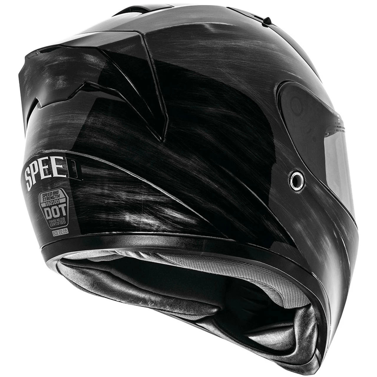 The Speed and Strength SS2100 Solid Speed Helmet gives riders a sweet style by way of a Grunged Black finish. And beneath the exterior, there’s plenty to love in an impressively designed package at a solid value. Take the quality of a Protective ABS Shell and Dual-Density Protective EPS System that forms a helmet that Meets or Exceeds DOT and ECE 22.05 standards, then add a Rear Spoiler for High-Speed Stability and style the front chin bar with a race-inspired air dam, and you have a helmet that meets your every need with looks to spare. The Optically Correct Anti-Fog/Anti-Scratch Face Shield Blocks 90% Of UV Rays, and a Drop Down Internal Sun Visor lowers to drop glare with the flip of a lever. With an Adjustable Air Ventilation System this helmet will see you through all-day track events or rides that keep you out on the streets long after the ‘sheeple’ have gone to sleep.