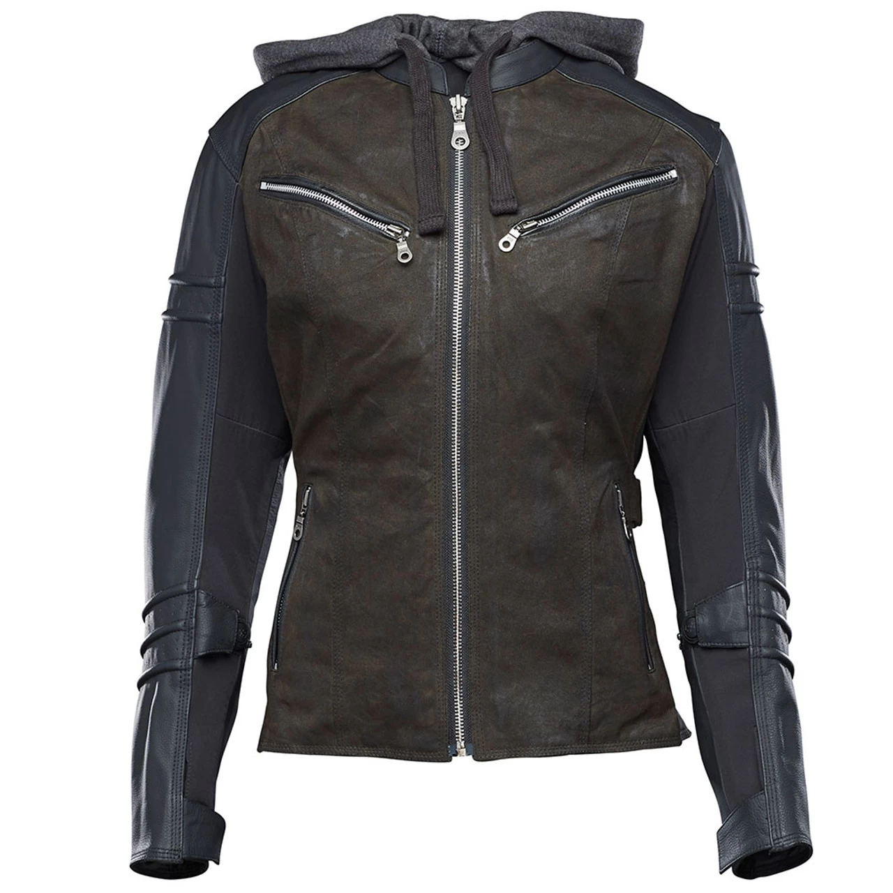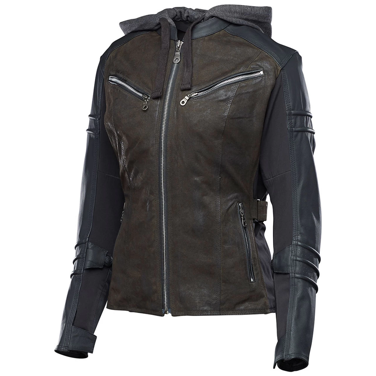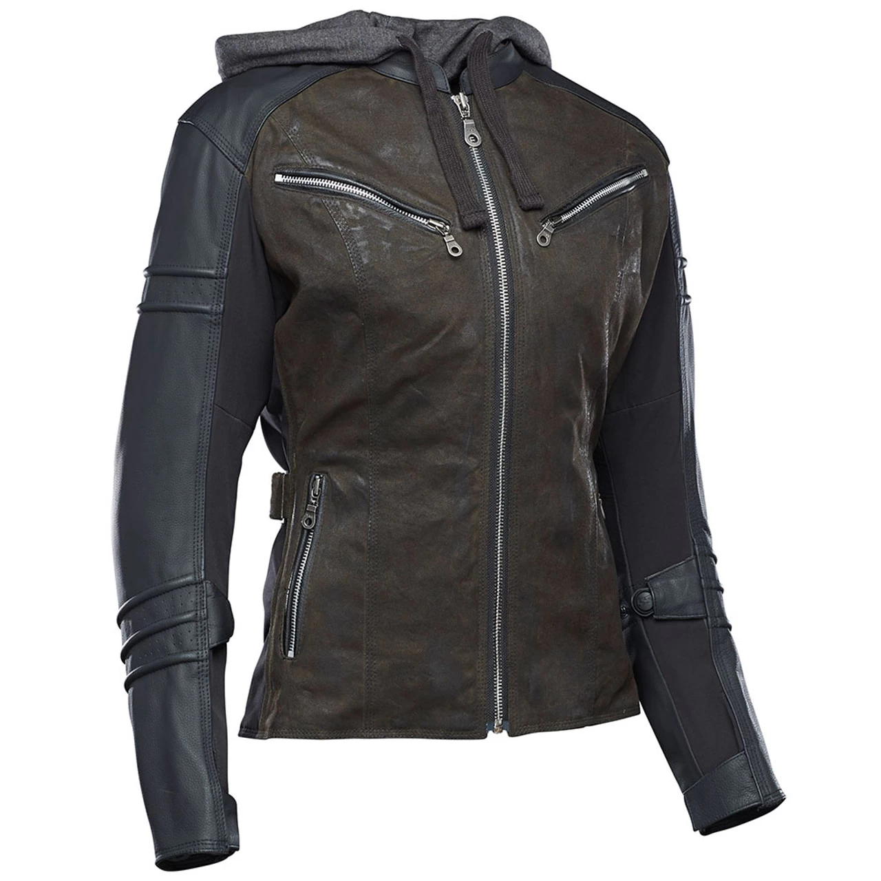 The Street Savvy Leather/Textile Jacket from Speed and Strength gives women riders a new option that blends leather and textile construction to produce a jacket that’s not only versatile in style but is packed with features for any situation. Grab yours in a subtle olive that blends well with black sleeves.
